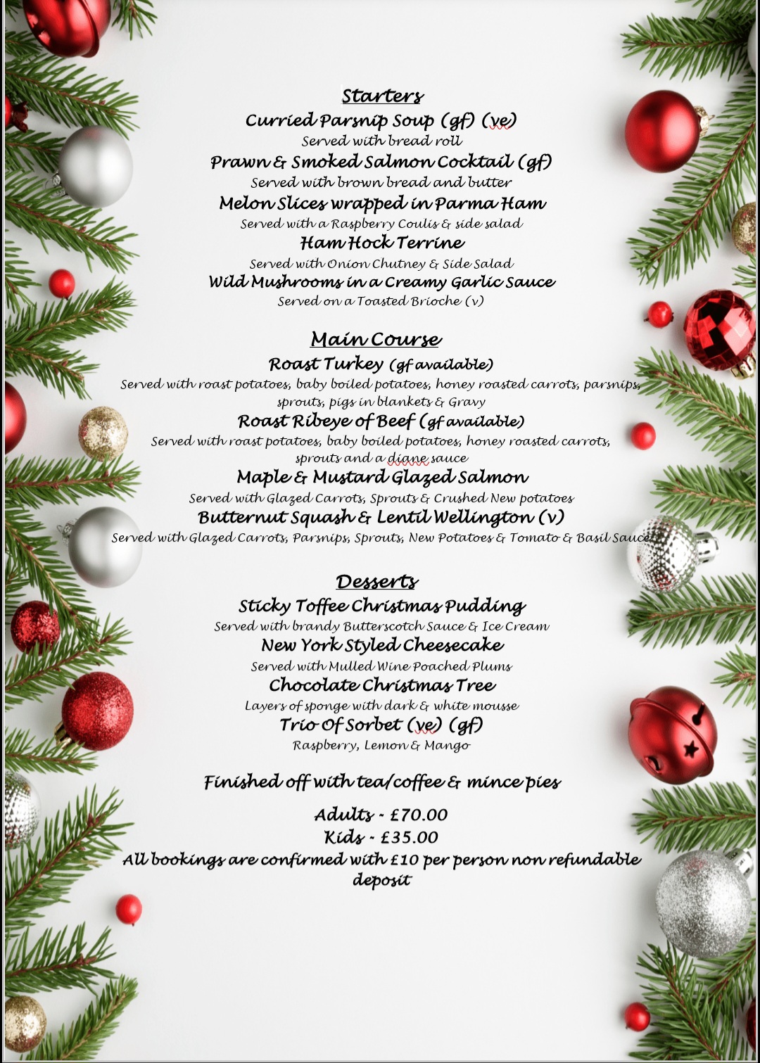 Served with roast potatoes, baby boiled potatoes, honey roasted carrots, parsnips, sprouts, pigs in blankets and gravy